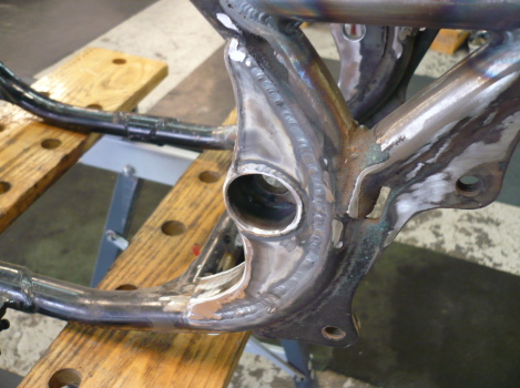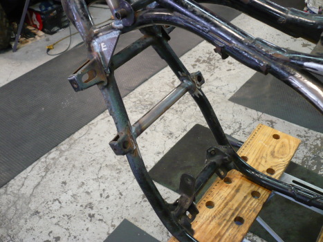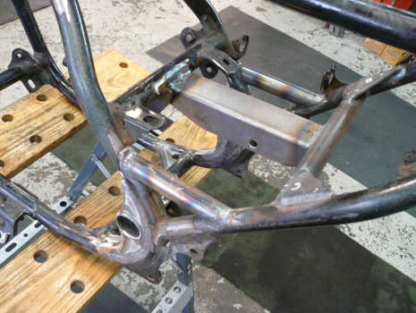 | 後方排気のリヤ周りを 取り付ける為のサスマウント フレームを追加 サス受けには過大な力が 加わる為、キッチリ補強する ピポット部分にも22パイの 補強が入る 合計4カ所の補強 |