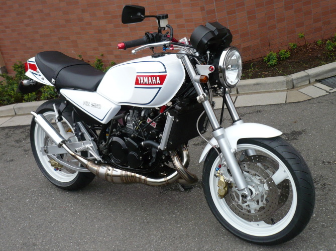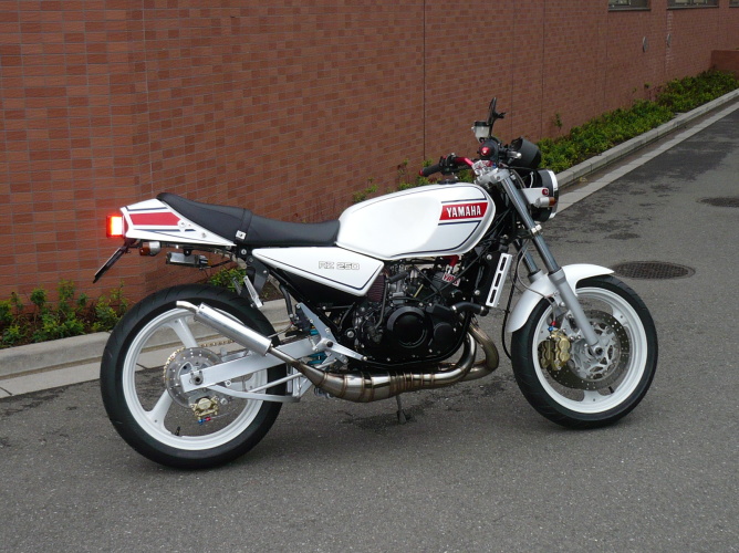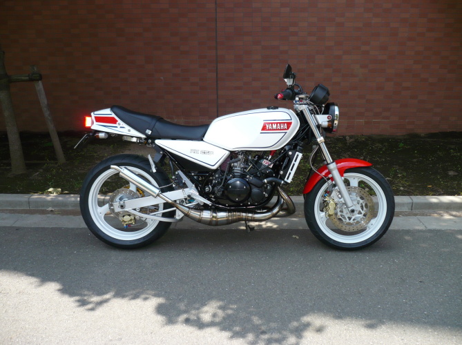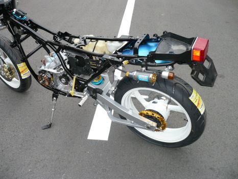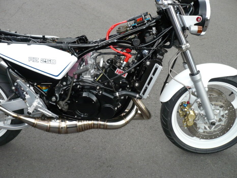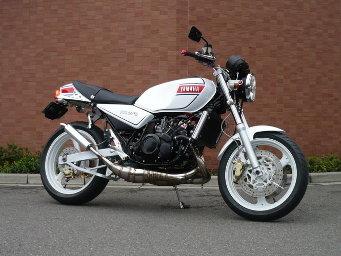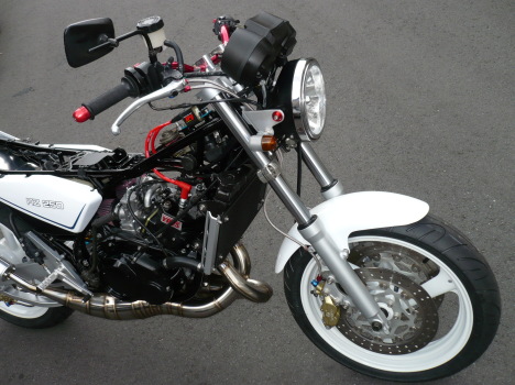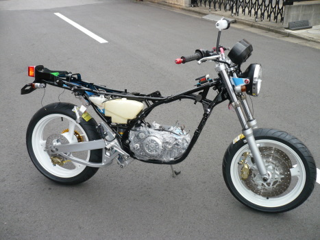 | 前後TZR250 89 スイングアームのみ90 フロント 110/70−17 リヤ 150/60−18 XJRのTOPでバーハン化 エンジン等、仮搭載 |